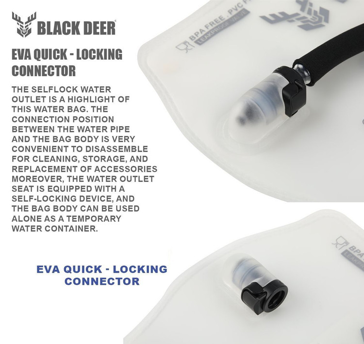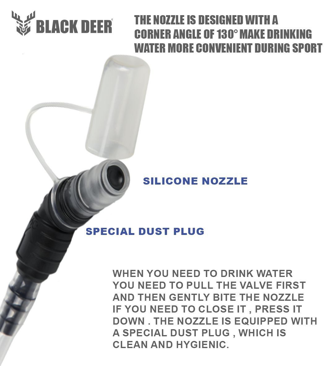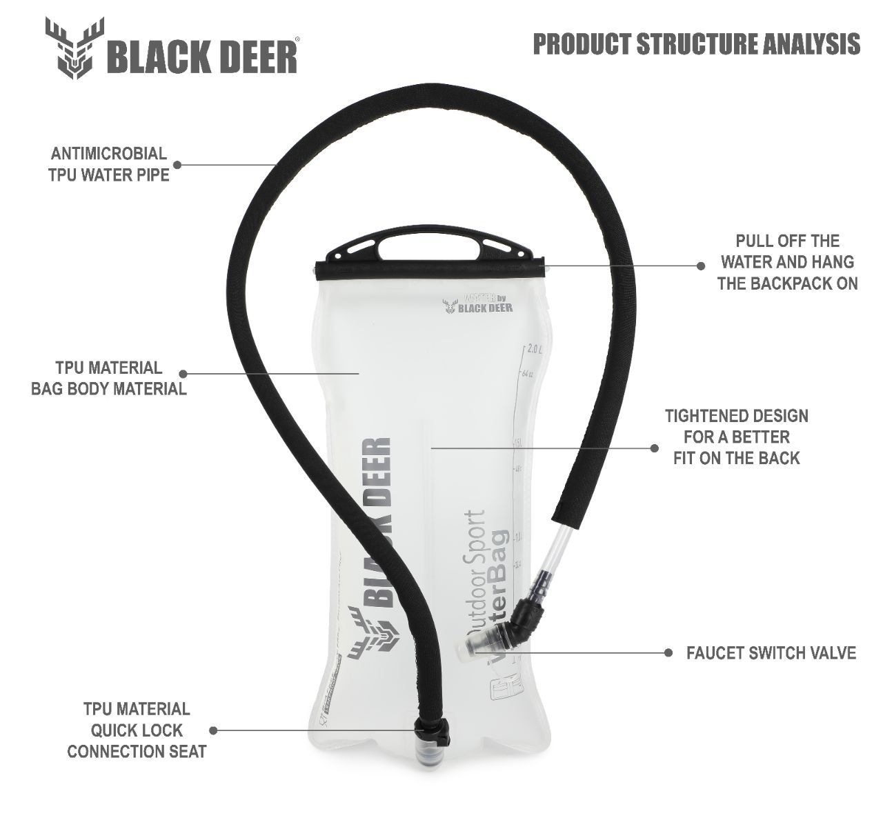 کمل بک بلک دیر با کیفیت عالی در حجم های 1.5 لیتر، 2 لیتر و 3 لیتر روانه بازار شده است که بنابر مدت زمان سفر می توانید یک گزینه مناسب انتخاب کنید. کمل بک یک کیسه آب ورزشی است که به جای بطری و قمقمه مورد استفاده قرار می گیرد. جنس بدنه پلاستیک TPU با مقاومت بسیار بالا در برابر دمای گرم و سرد است و مناسب حمل نوشیدنی های گرم و سرد است. این کمل بک توسط شرکت بلک دیر (BLACK DEER) تهیه شده است که این شرکت کمل بک ها را فاقد مواد مضر BPA و مجهز به BPA روانه بازار می کند و به سلامتی مصرف کنندگان توجه خاصی دارد. این کمل بک برای فعالیت های کوهنوردی، گردشگری، سنگ نوردی و صحرا نوردی فوق العاده عالی است، زیرا نیاز به توقت کردن برای آب رسانی به بدن ندارید و تنها با مکیدن شلنگ می توانید از کمل بک داخل کوله پشتی به راحتی آب بنوشید. ته لوله یا شلنگ این کیسه آب، به خوبی آب بندی شده است که مانع از نشت آب و کندن شلنگ می شود. یکی از مزیت های این کیسه ظرفیت 3 لیتری با حجم کم است که با استفاده از آن می توانید مقدار بسیار بیشتری آب همراه خود حمل کنید و آب آشامیدنی یک یا دو روز خود را به راحتی تامین کنید.