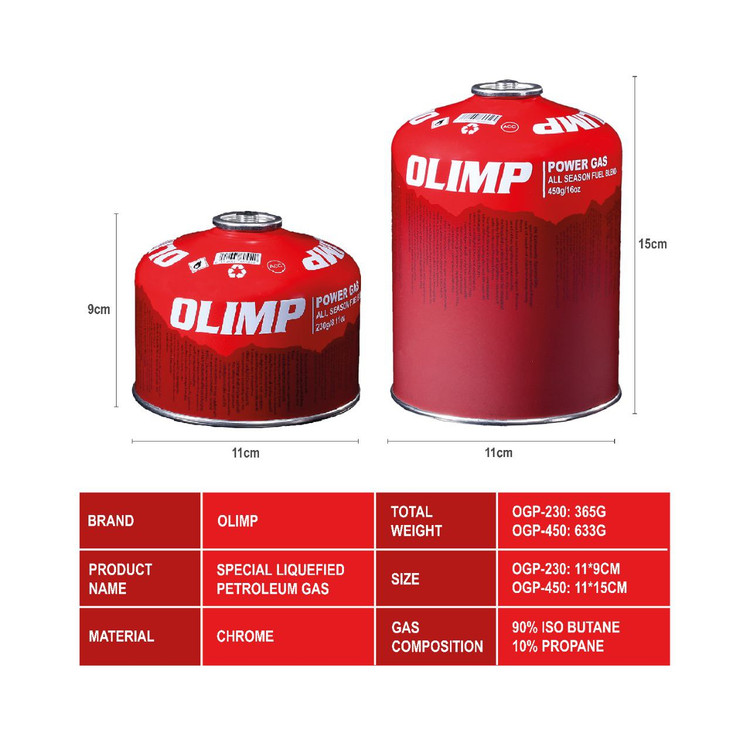 کپسول گاز پیچی OLIMP دردو مدل 230 و 450گرمی تولید شده توسط شرکت بزرگ الیمپ بوده که دارای کیفیت ساخت بالا و مناسب انواع سفر های کمپینگ می باشد. محتوای اصلی این کپسول گاز قابل حمل گاز بوتان بوده اما 10 درصد آن را نیز گاز پروپان تشکیل می دهد. جنس بدنه فلزی آن در برابر ضربه های عادی و قرار گیری در شرایط جوی مختلف آسیبی ندیده و به دلیل داشتن درپوشی مجزا از ایمنی بالایی برخوردار میباشد.