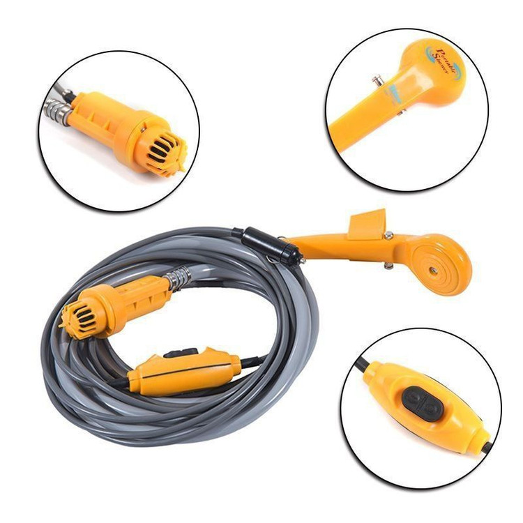 دوش سفری برقی مناسب برای سفر، شستشو خودرو می باشد. برای استفاده از این دوش صحرایی کافیست دکمه روشن و خاموش پمپ و دکمه تنظیم فشار آب در قسمت دسته روی دوش را بزنید.