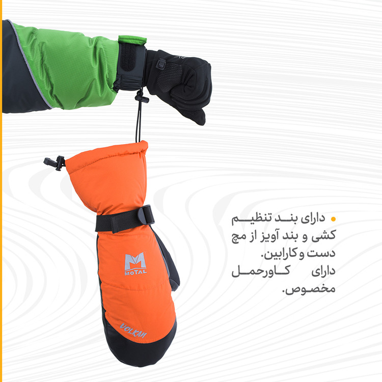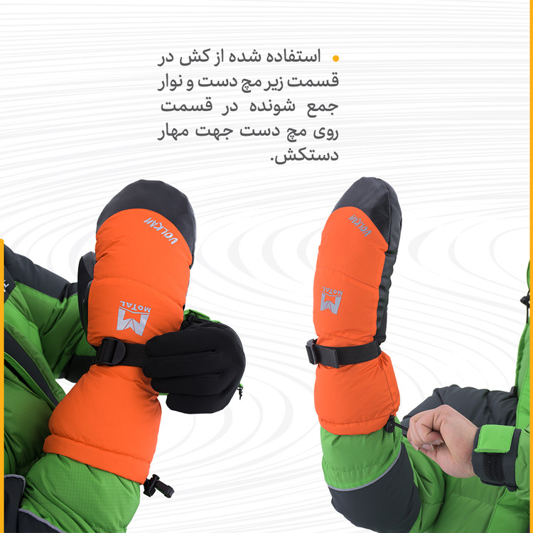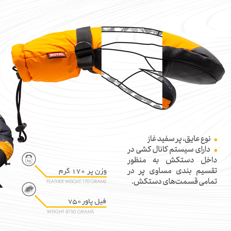 🔴در ضمن این دستکش در داخل خود به سیستم کانال کشی مجهز است که تمام پرها بصورت یکسان در سرتاسر آن قرار گرفته اند. دور مچ دست در آن، بوسیله ی بند برزنتی و کش فیکس می شود و در لبه های آن، روی ساعد دست بند کشی قابل تنظیمی قرار گرفته که مانع ورود سرما و گردوغبار به داخل دستکش می شود.