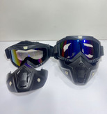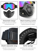 🔴عینک goggles مناسب برای موتورسواری و اسکی و اسکیت میباشد و شیشه عینک به طوری است که با فیلتر کردن رنگ دودی از خستگی چشم در پیست اسکی و کوهستان های برفی جلوگیری میکند عینک goggles دارای ماسک فیلتر دار و با قابلیت دو تکه شدن هم استفاده به صورت عینک و هم استفاده به صورت عینک و فک مناسب برای تمام فصول و محیط میباشد کناره های داخل عینک ماسک از اسفنج نرم پوشیده شده که مانع از فشار به اطراف چشم میشود و می تواند همراه با کلاه کاسکت های موتورسیکلت بدون فک و بدون شیشه به راحتی استفاده شود