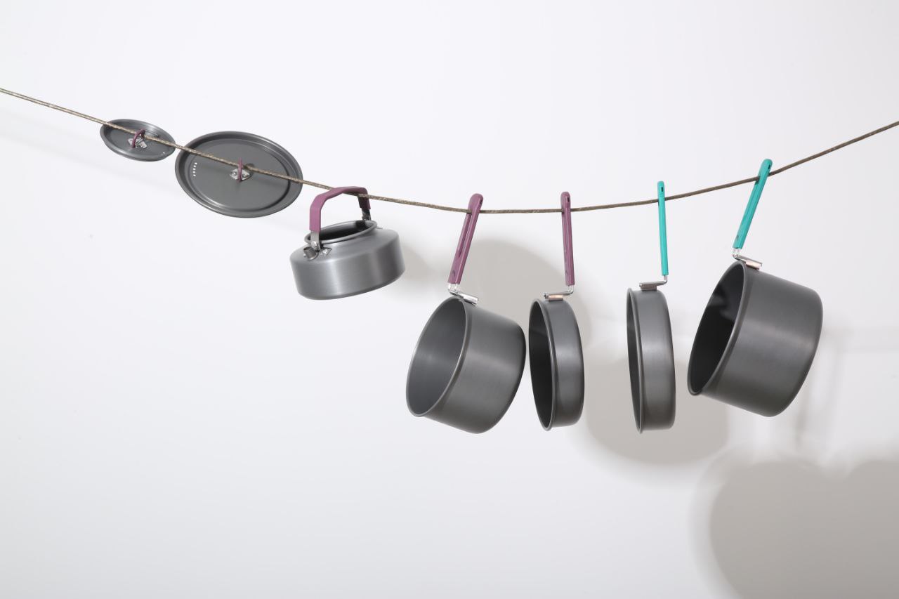 بعد از اتمام کار تمام ظروف، به راحتی درون قابلمه جای می گیرند. سپس این مجموعه جمع شده، در یک کیسه توری، قرار می گیرند. این طراحی هوشمندانه و خلاقانه، برای کوهنوردی و کمپینگ بسیار مناسب است.