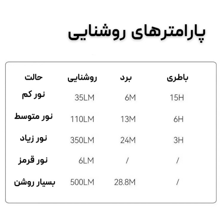 - زیاد: 350 لومن (3 ساعت) تا فاصله 24 متری