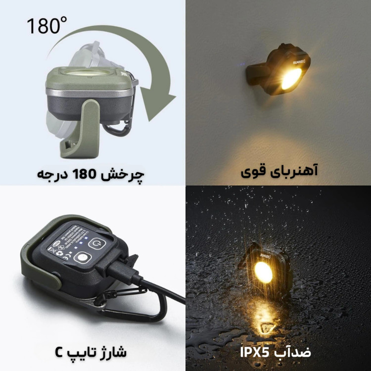 چراغ سانری C500 میتواند تا 180 درجه بچرخد، بنابراین شما میتوانید جهت نور را به آسانی تنظیم کنید. همچنین، دارای یک قلاب برای آویختن به اشیاء مختلف است که استفاده از آن را بسیار راحتتر میکند.