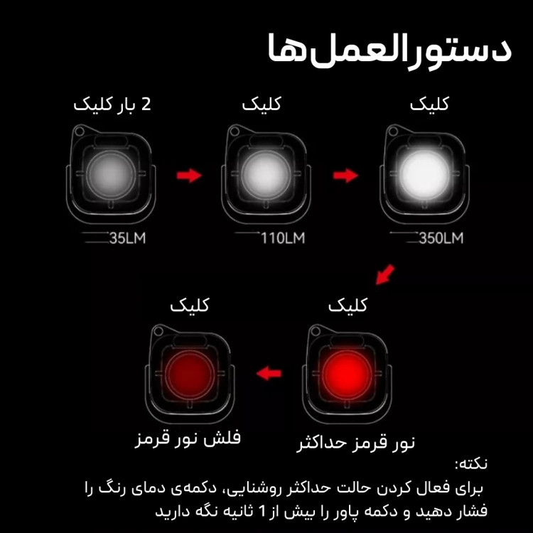 - نور قرمز: 6 لومن (15.5 ساعت)