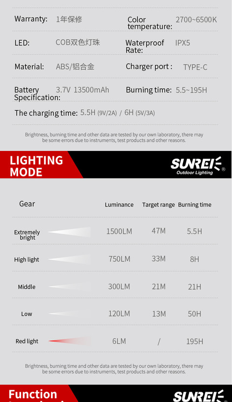 رنگ نور: آفتابی و سفید (2700K-6500K)، قرمز