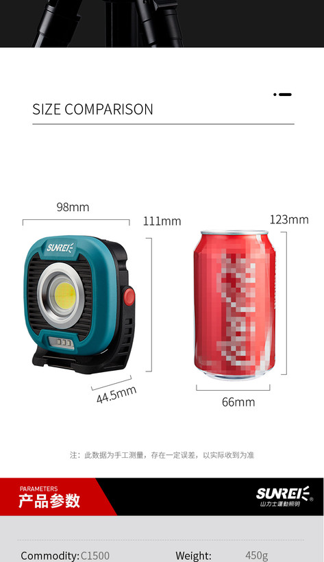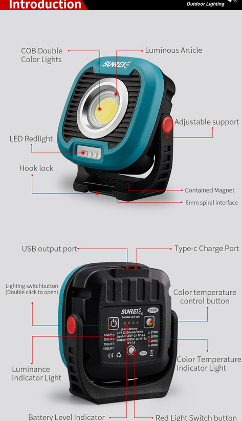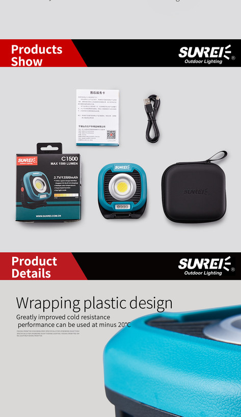 نورافکن سانری مدل C1500 یک چراغ شارژی قدرتمند، مقاوم و چند منظوره برای استفاده در شرایط مختلف است. این نورافکن دارای باتری لیتیوم یونی 13500mAh و پورت شارژ Type C است.
