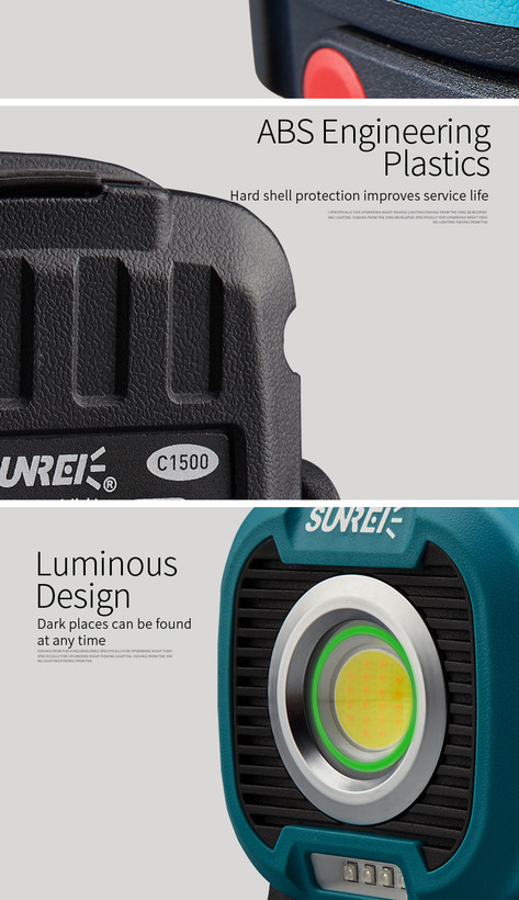 به لطف نوع طراحی کاربردی نورافکن C1500، میتوان از آن به شکل دستی، ایستاده، بر روی سه پایه (پیچ شدن)، آهن ربایی و قلاب شده (آویزان) استفاده کرد. آهن ربای پرقدرت قرار داده شده در دسته به راحتی به سطوح فلزی متصل می شود. همچنین دسته قابلیت تاشو (تا زاویه 180 درجه) دارد تا به وسیله آن بتوان نورافکن را به راحتی آویزان کرد. دسته نورافکن تا 180 درجه قابل تنظیم است. این نوارفکن با استاندارد IPX5 در برابر نفوذ آب مقاوم بوده و قابلیت استفاده در دمای 20- تا 60+ درجه سانتیگراد را دارد. در تولید آن نیز از آلیاژ آلومینیوم، PA66-GF30 و پلاستیک ABS استفاده شده است.
